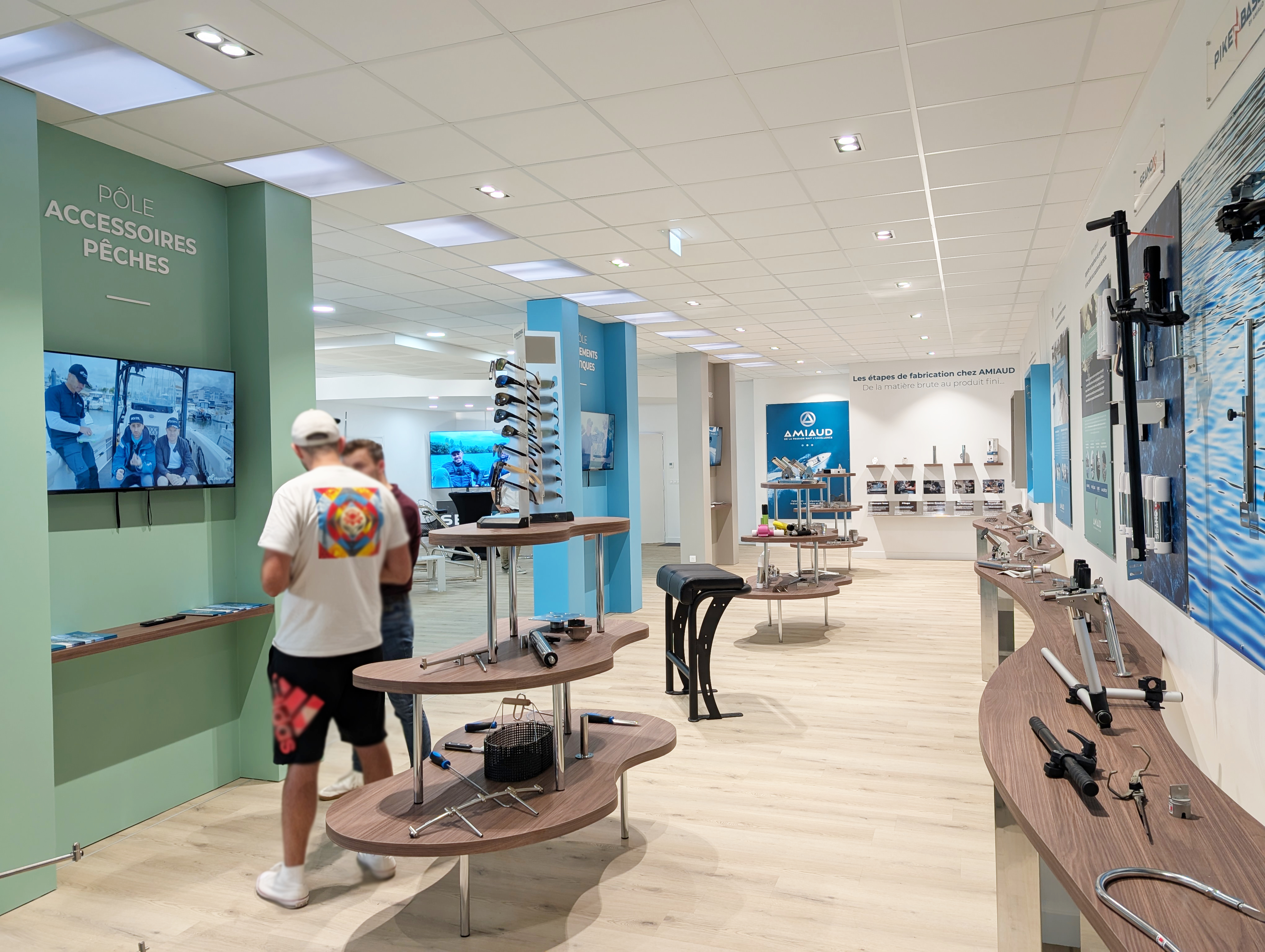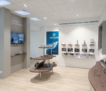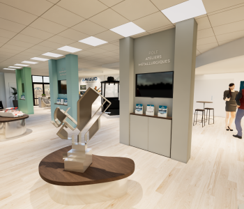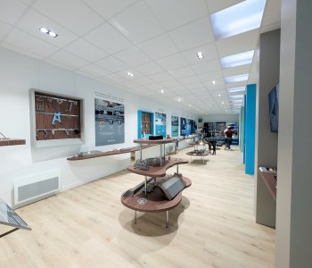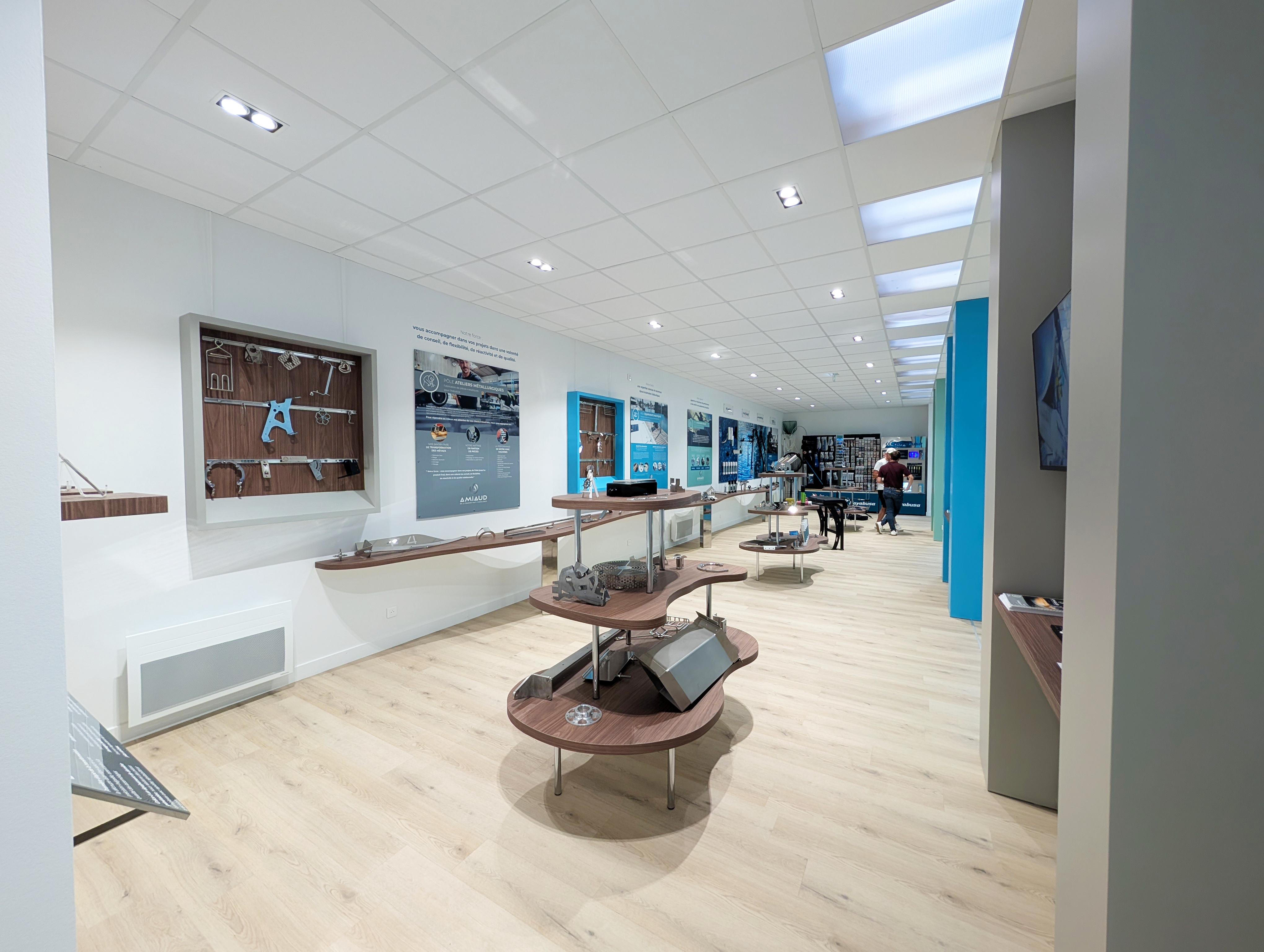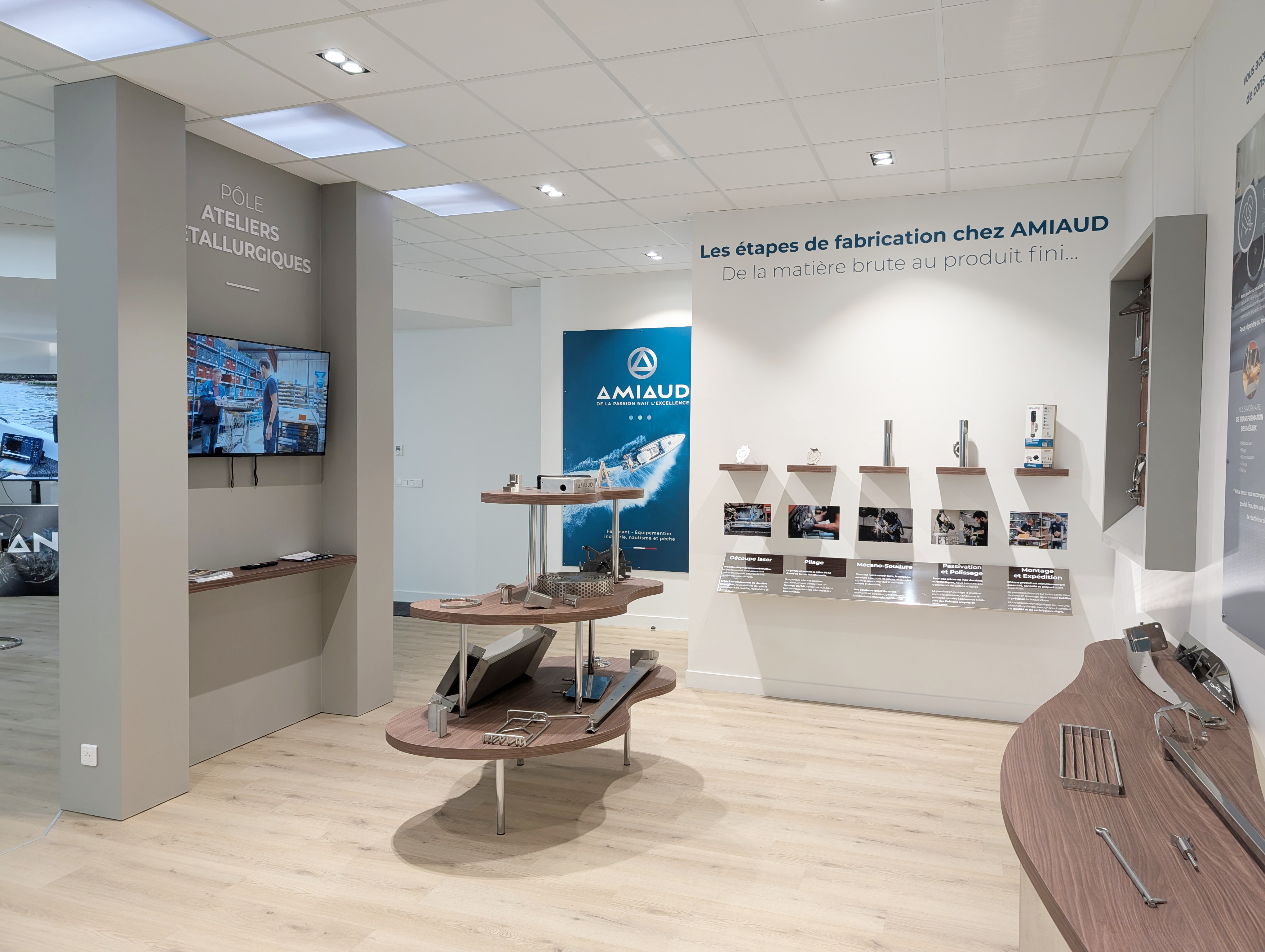Le projet a consisté à repenser et agrandir le showroom afin d’offrir une expérience plus immersive et cohérente. Un nouveau concept a été développé en étroite relation avec la charte graphique de l’entreprise, assurant une continuité visuelle et identitaire dans l’aménagement des espaces. Au-delà de l’aspect esthétique, l’aménagement a été conçu pour valoriser le savoir-faire de l’entreprise, refléter ses valeurs fondamentales et mettre en lumière la diversité de ses domaines d’intervention. Chaque espace du showroom devient ainsi un support narratif, pensé pour illustrer concrètement l’expertise et l’engagement d’Amiaud.
