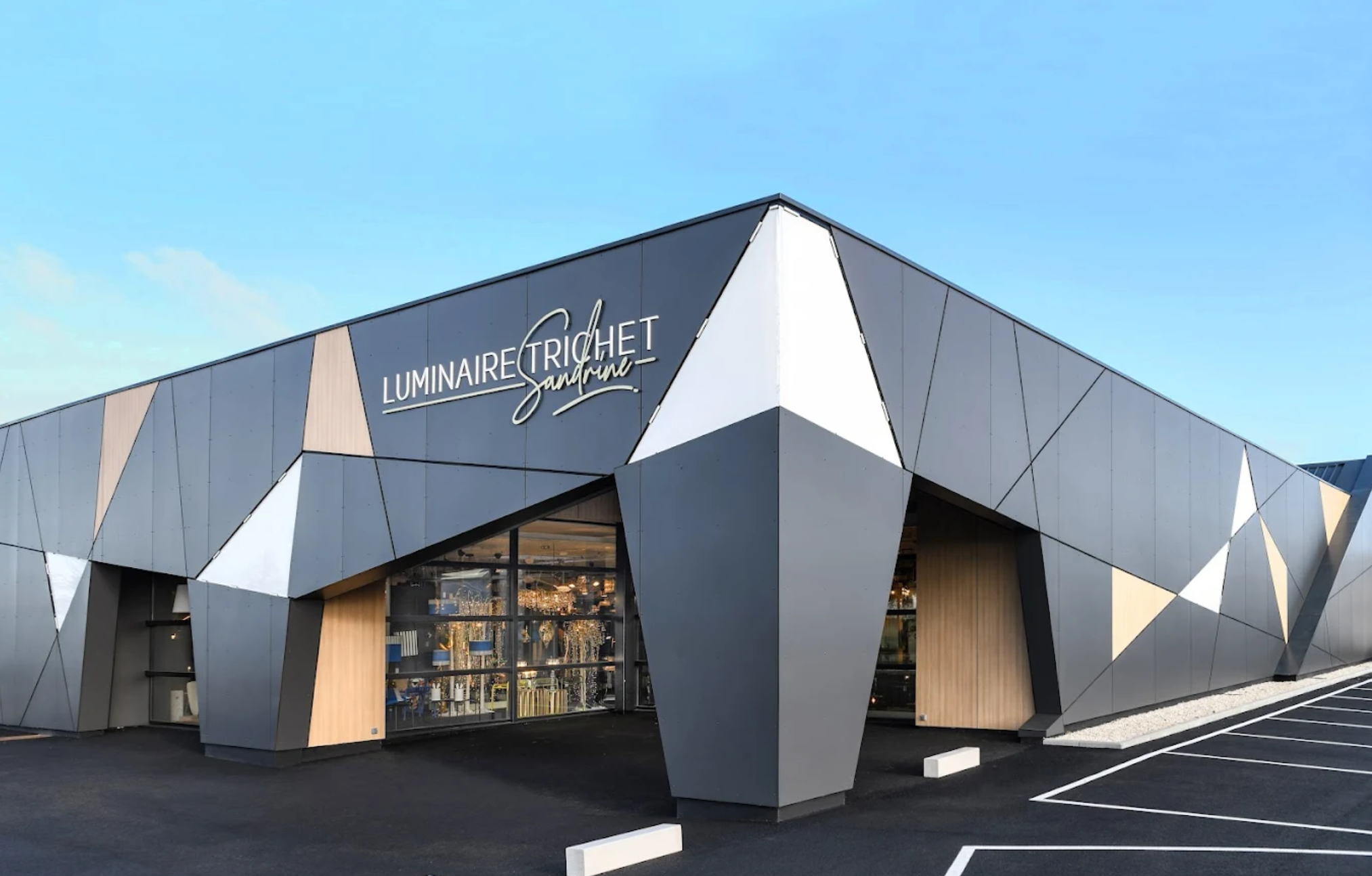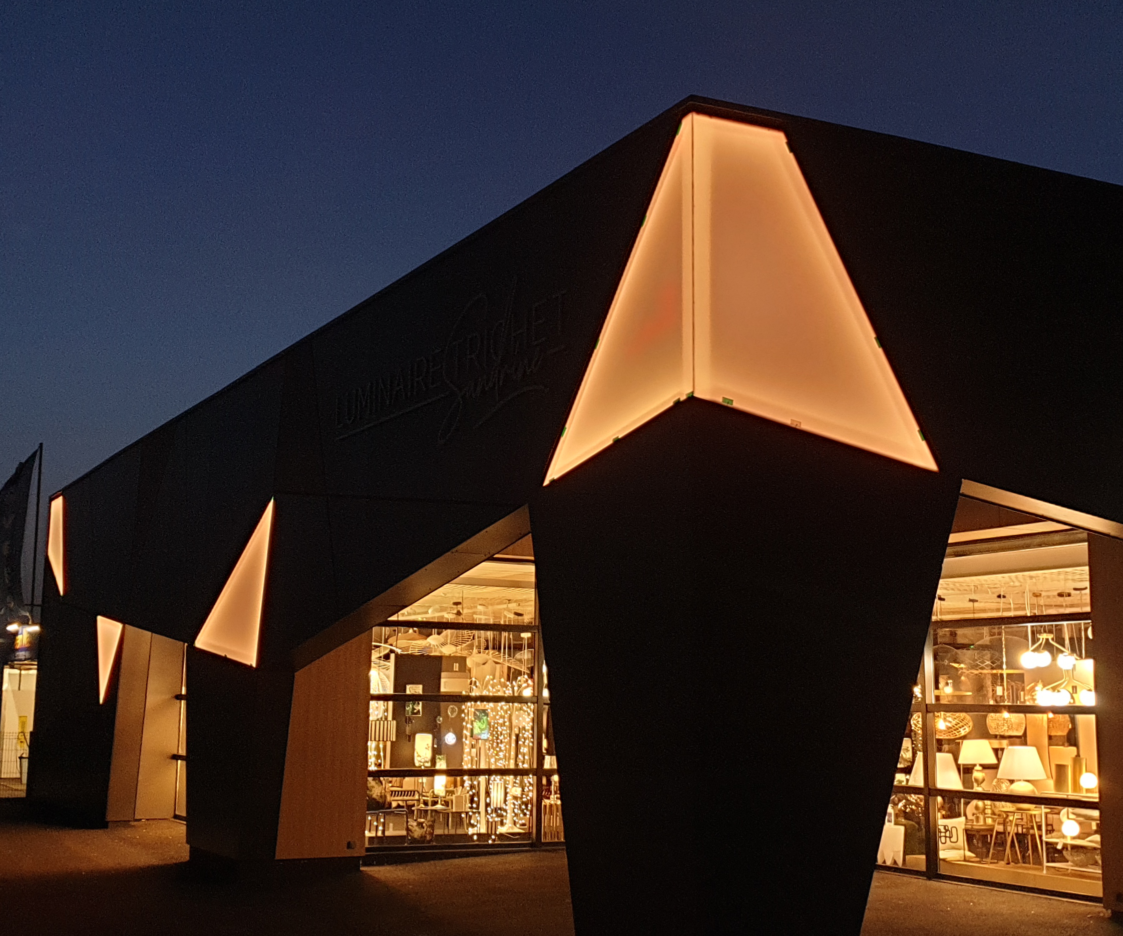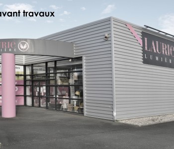 Ce projet a consisté en une transformation complète des façades afin de redéfinir l’image du bâtiment et de corespondre avec la volonté du client d’inscrire son enseigne dans une démarche de montée en gamme. L’intervention architecturale intègre des éléments lumineux directement en façade, établissant un lien visuel fort avec l’univers des produits proposés et renforçant l’identité du magasin.